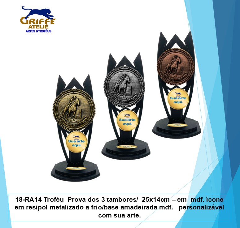 18-RA14 Troféu Prova dos 3 tambores/ 25x14cm – em mdf. ícone em resipolmetalizado a frio/base amadeirada mdf. personalizável com sua arte.