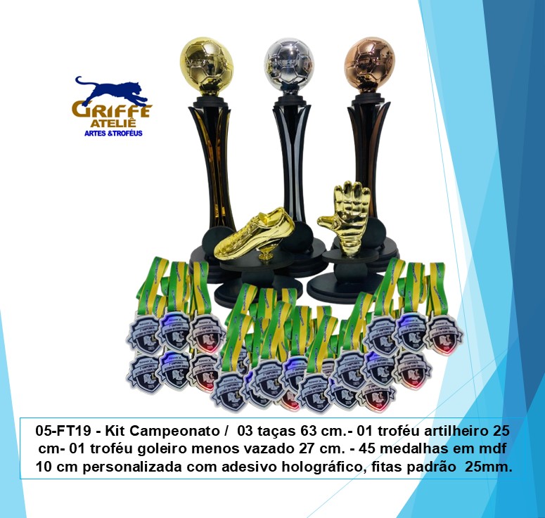 05-FT19–Kit de troféus p/ Campeonato de futebol/ 03 taças 63 cm.- 01 troféu artilheiro 25 cm-01 troféugoleiro menos vazado 27 cm. – 45 medalhas em mdf 10 cmpersonalizada com adesivo holográfico, fitas padrão 25mm.