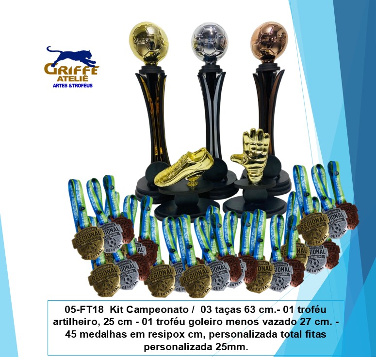 05-FT18 Kit troféus p/ Campeonato de futebol / 03 taças 63 cm.- 01 troféu artilheiro, 25 cm