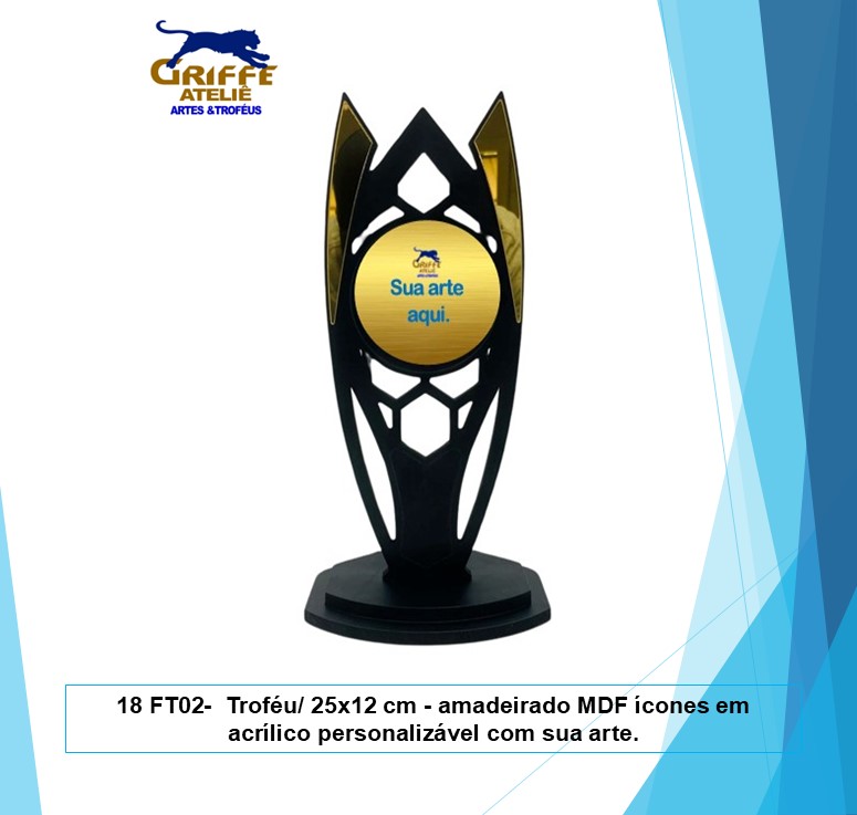 18 FT02- Troféu/ 25×12 cm – amadeirado MDF ícones em acrílico personalizável com sua arte.