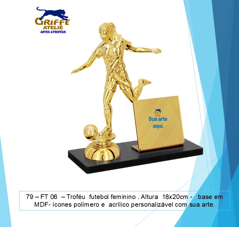 79– FT 06 – Troféu Futebol Feminino .Altura 18x20cm – base em MDF- ícones polímero e acrílico personalizável com sua arte.