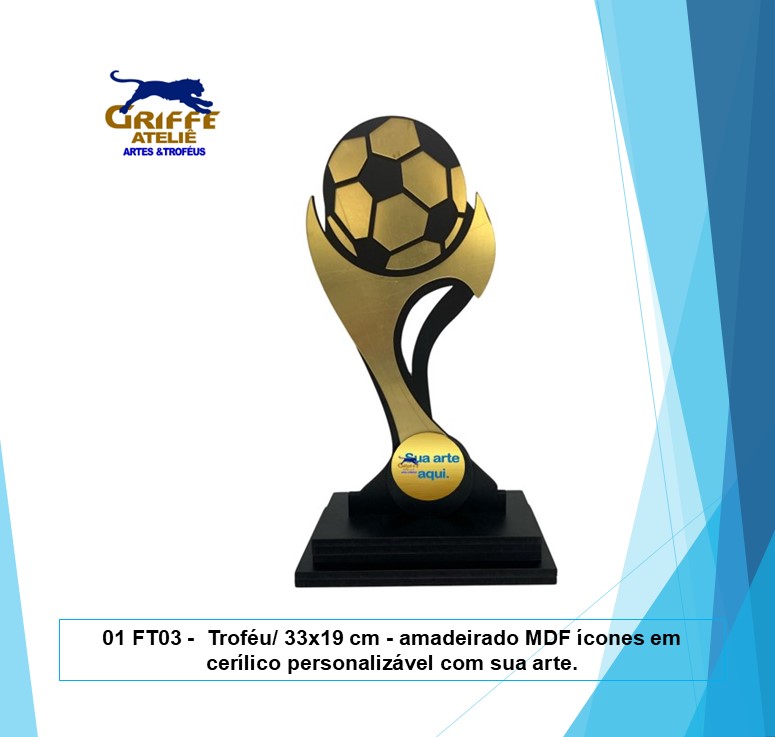 01FT03 – Troféu p/ Futebol 33×19 cm – amadeirado MDF, ícones em cerílico personalizável com sua arte.