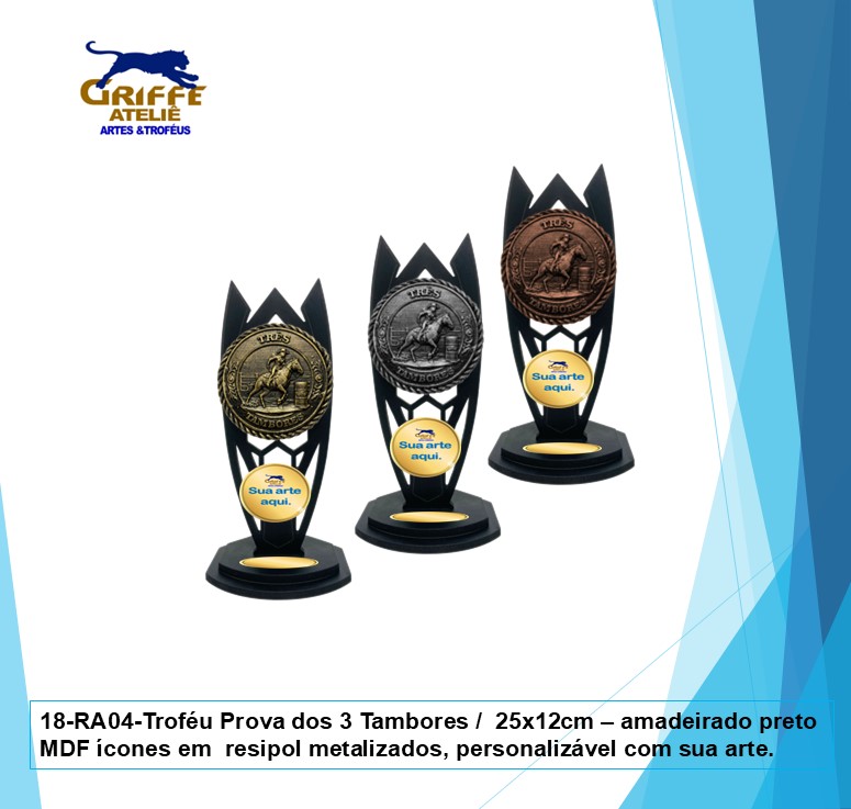 18-RA04-Troféu Prova dos 3 Tambores / 25x12cm – amadeirado preto MDF ícones em resipol metalizados, personalizável com sua arte.
