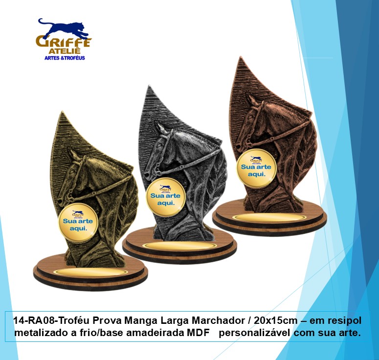 14-RA08-Troféu Prova Manga Larga Marchador / 20x15cm – em resipol metalizado a frio/base amadeirada MDF personalizável com sua arte.