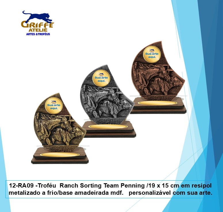 12-RA09 -Troféu Ranch Sorting Team Penning /19 x15 cm em resipol metalizado a frio/base amadeirada mdf. personalizável com sua arte.