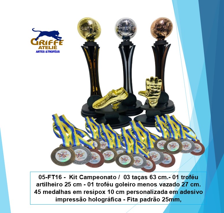 005-FT16- TroféusCampeonato de futebol/ 03 taças 63 cm.- 01 troféu artilheiro 25 cm – 01 troféu goleiro menos vazado 27 cm.45 medalhas em resipox 10 cm personalizada em adesivo impressão holográfica – Fita padrão